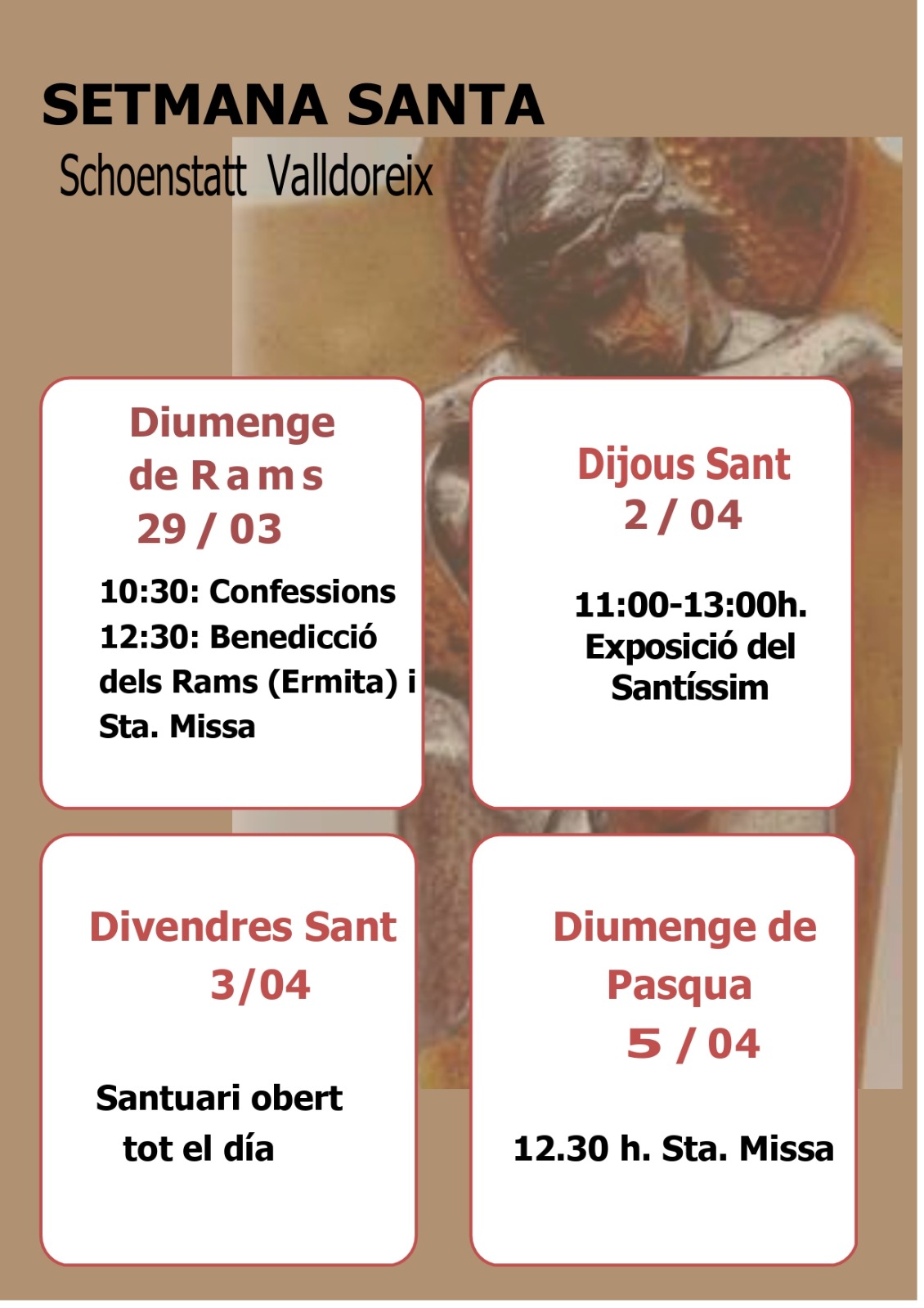 Aquí puedes encontrar los orarios de Semana Santa en el Santuario de Schoenstatt en Valldoreix: